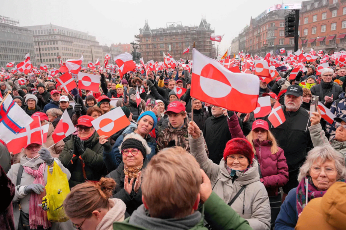 আলোর যুগ প্রতিনিধিঃ যুক্তরাষ্ট্রের প্রেসিডেন্ট ডোনাল্ড ট্রাম্পের গ্রিনল্যান্ড দখলের পরিকল্পনার বিরুদ্ধে প্রতিবাদ জানাতে ডেনমার্কের রাজধানী কোপেনহেগেনের হাজার হাজার বাসিন্দা শনিবার রাস্তায় নেমেছেন। একই দিনে গ্রিনল্যান্ডের রাজধানী নুকেও বিক্ষোভ অনুষ্ঠিত হয়। কোপেনহেগেনে বিক্ষোভকারীরা গ্রিনল্যান্ডের পক্ষে নানা স্লোগান দেন। তাদের প্ল্যাকার্ডে লেখা ছিল ‘গ্রিনল্যান্ড থেকে হাত সরাও’ ও ‘গ্রিনল্যান্ড গ্রীনল্যান্ডিয়াদের জন্য’।
