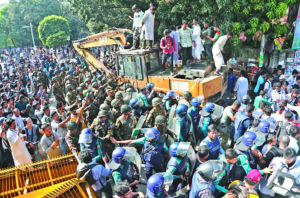আলোর যুগ প্রতিনিধিঃ রাজধানীর ধানমন্ডি ৩২ নম্বরে শেখ মুজিবুর রহমানের বাড়ি ভাঙা কেন্দ্র করে আইনশৃঙ্খলা রক্ষাকারী বাহিনীর সঙ্গে ছাত্র-জনতার দফায় দফায় সংঘর্ষ ঘটেছে। গতকাল বেলা ১টার দিকে বিক্ষোভকারীরা দুটি এক্সকেভেটর নিয়ে ধানমন্ডি ৩২ নম্বর সড়কে ঢুকতে গেলে বাধা দেয় আইনশৃঙ্খলা রক্ষাকারী বাহিনী। এর পরই শুরু হয় ধাওয়া-পাল্টা ধাওয়া এবং দফায় দফায় সংঘর্ষ। আইনশৃঙ্খলা রক্ষাকারী বাহিনী পরিস্থিতি নিয়ন্ত্রণে আনতে লাঠিচার্জ, টিয়ার শেল ও সাউন্ড গ্রেনেড নিক্ষেপ করে। সন্ধ্যা পর্যন্ত কলাবাগান, সোবহানবাগ ও পান্থপথসহ আশপাশ এলাকায় চলতে থাকে থেমে থেমে সংঘর্ষ।